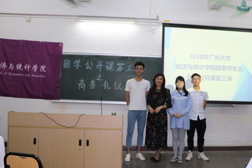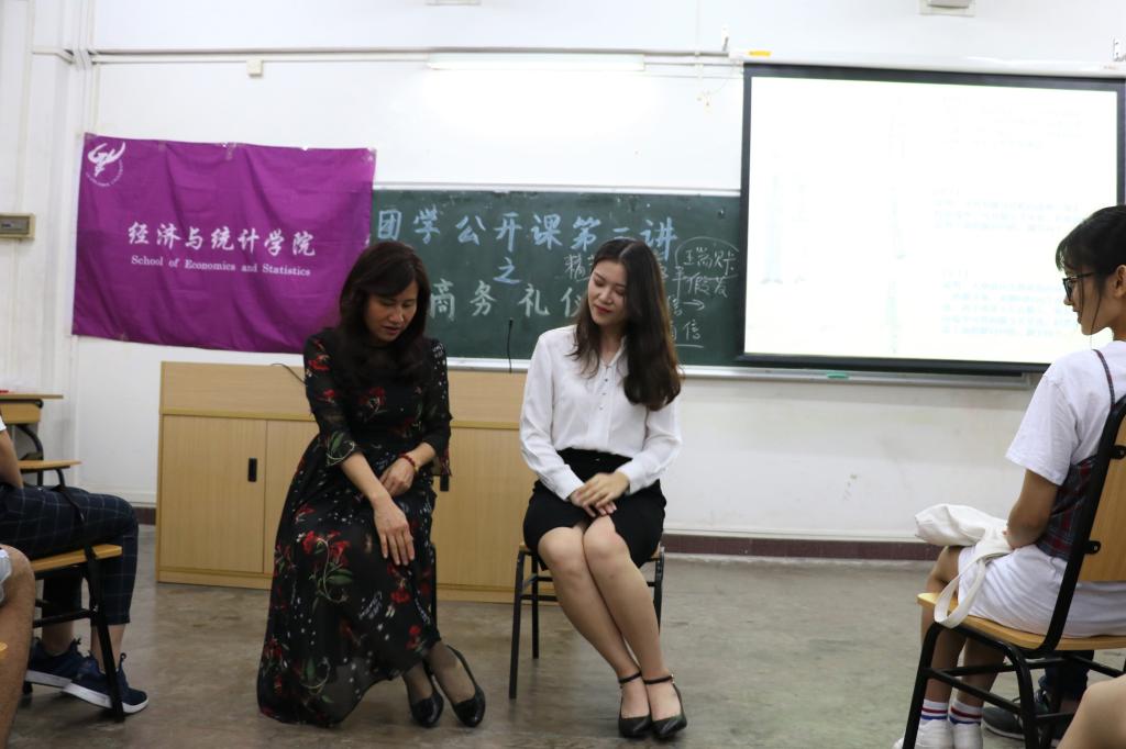 除了以上的三大部分, 在这堂课中,张丽璇老师还多次强调作为经统学子的我们掌握商务礼仪的必要性。最后,张老师总结道:“男生要高富帅,高于眼界,富于实践,帅在修养;女生要白富美,白于品性,富于思考,美在礼貌。