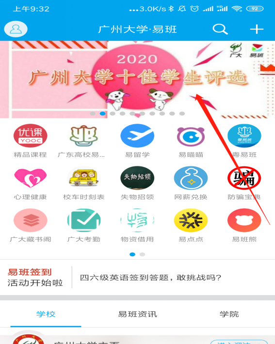 (一)打开手机易班APP,进入广州大学页面,点击“十佳学生评选”图标。