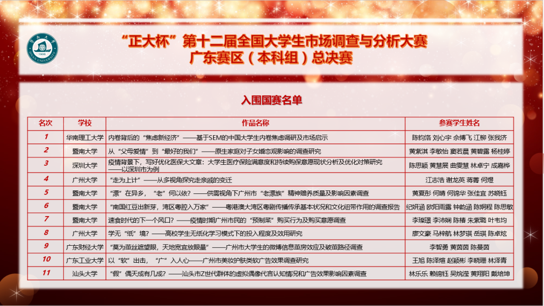 2022年4月23日,“正大杯”第十二届全国大学生市场调查与分析大赛广东赛区(本科生组)总决赛在腾讯会议线上举行。我校共有三支队伍进入广东赛区决赛,经过文档评审及现场答辩,我校队伍分别获得广东赛区(本科生组)总决赛第四名、第八名和第二十一名的好成绩。