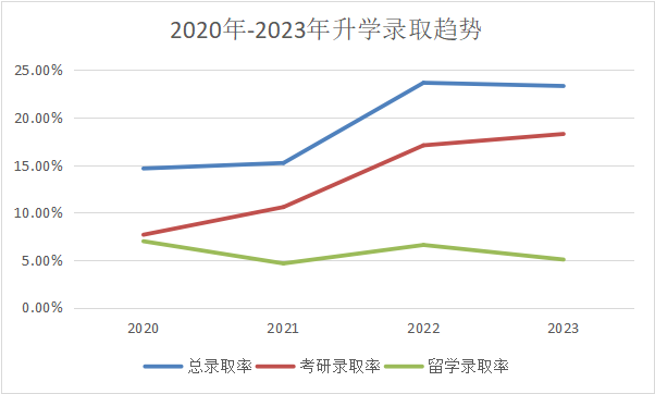 境内考研录取率呈现逐年上升趋势,今年境内升学人数为76人,录取率18.27%,相比2020年上升10.61%,是四年来录取人数最多的一年。