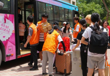 尽管烈日炎炎,但身着橙色马甲的志愿者们全副武装,推着小车,一次次从车上运下行李,一趟趟往返于车辆和宿舍楼之间,不辞辛苦的他们充分展现了志愿者无私的奉献精神。