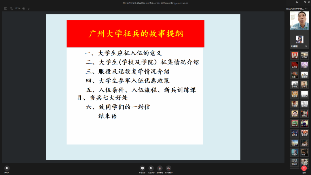 首先,林老师以“投身军旅,绽放青春”为主题向我们介绍了大学生应征入伍的意义、我校征集情况、服役与退役复学情况、参军优惠政策、入伍的条件与流程等。