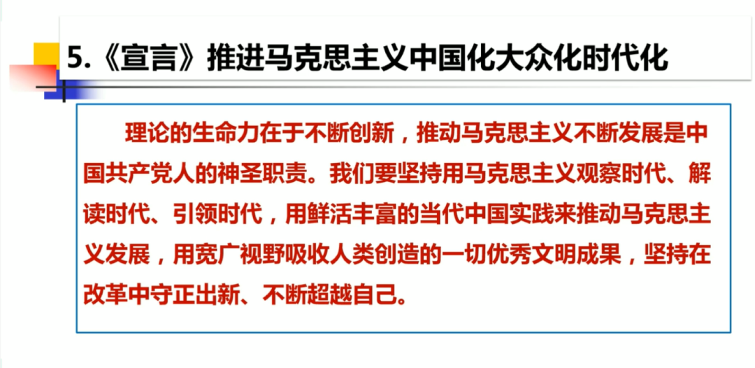 周教授表示《共产党宣言》对指引中国特色社会主义发展具有重要意义。《共产党宣言》始终提供观察、分析、改造人类社会的强大的思想武器。周教授认为,《宣言》揭示的真理、指引的目标、高尚的价值、坚定的原则、科学的方法、饱满的激情,都是我们这个时代不可或缺的精神力量。